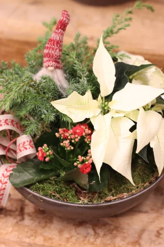 Joulukorissa on joulutähti, tulilatva, havukasvi ja koristeet