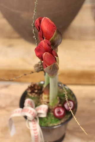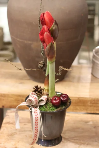Joulukorissa on punainen jaloritarinkukka ja koristeet
