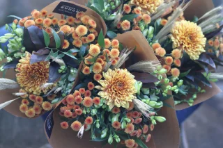 Kuvan tuotteessa on: Krysanteemi, alstromeria, dracena, ruscus