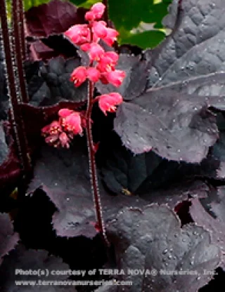 Heuchera 'Black Forest Cake' on koristeellinen monivuotinen kasvi, jolla on tumman suklaaväriset, melkein mustat lehdet ja punainen kukinta.