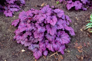 Heuchera 'Electric Plum' on näyttävä monivuotinen kasvi, jonka kiiltävät, syvän luumunvioletit lehdet tummine lehtisuonineen luovat voimakkaan värikontrastin.