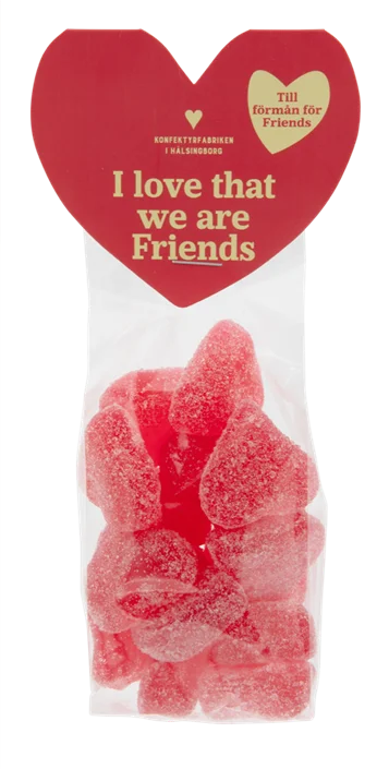 'I love that we are friends' on täynnä sokerisia hyytelösydämiä joissa on vadelman maku.