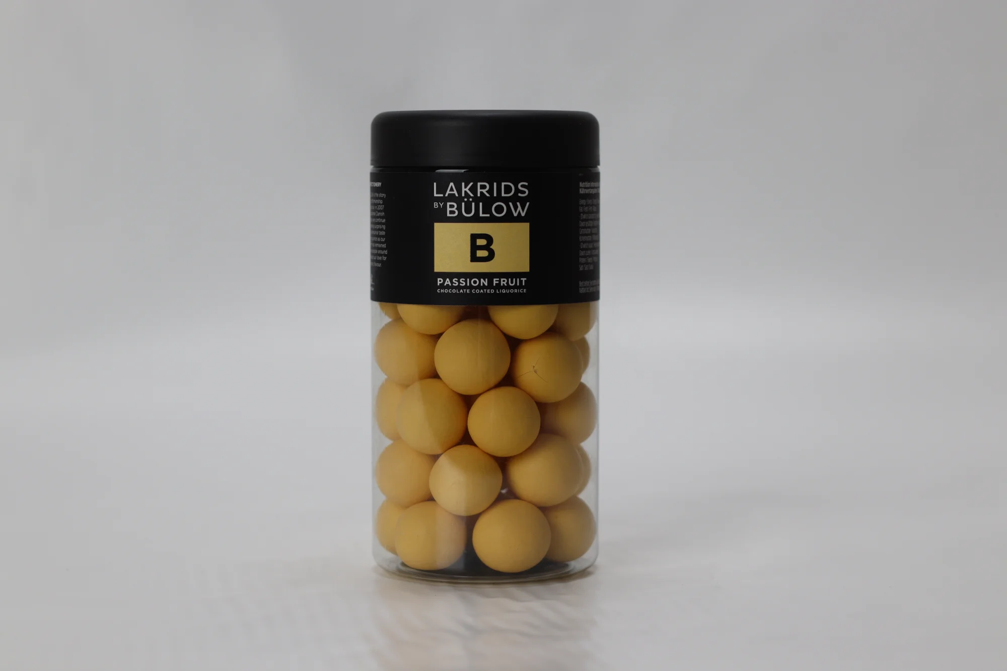 Passionhedelmällä, valkosuklaalla ja sokerilla kuorrutettu makea lakritsi.