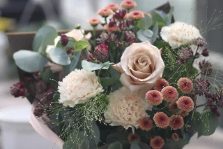Kuvan tuotteessa on: ruusu, neilikka, krysanteemi,tähtiputki, hirssi, eucalyptus