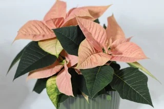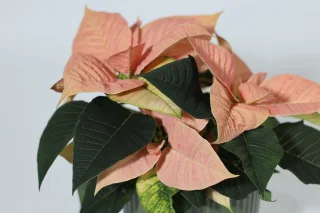 Suomessa viljelty, monilatvainen, lämmin vaaleanpunainen joulutähti vihreässä keramiikkaruukussa.
