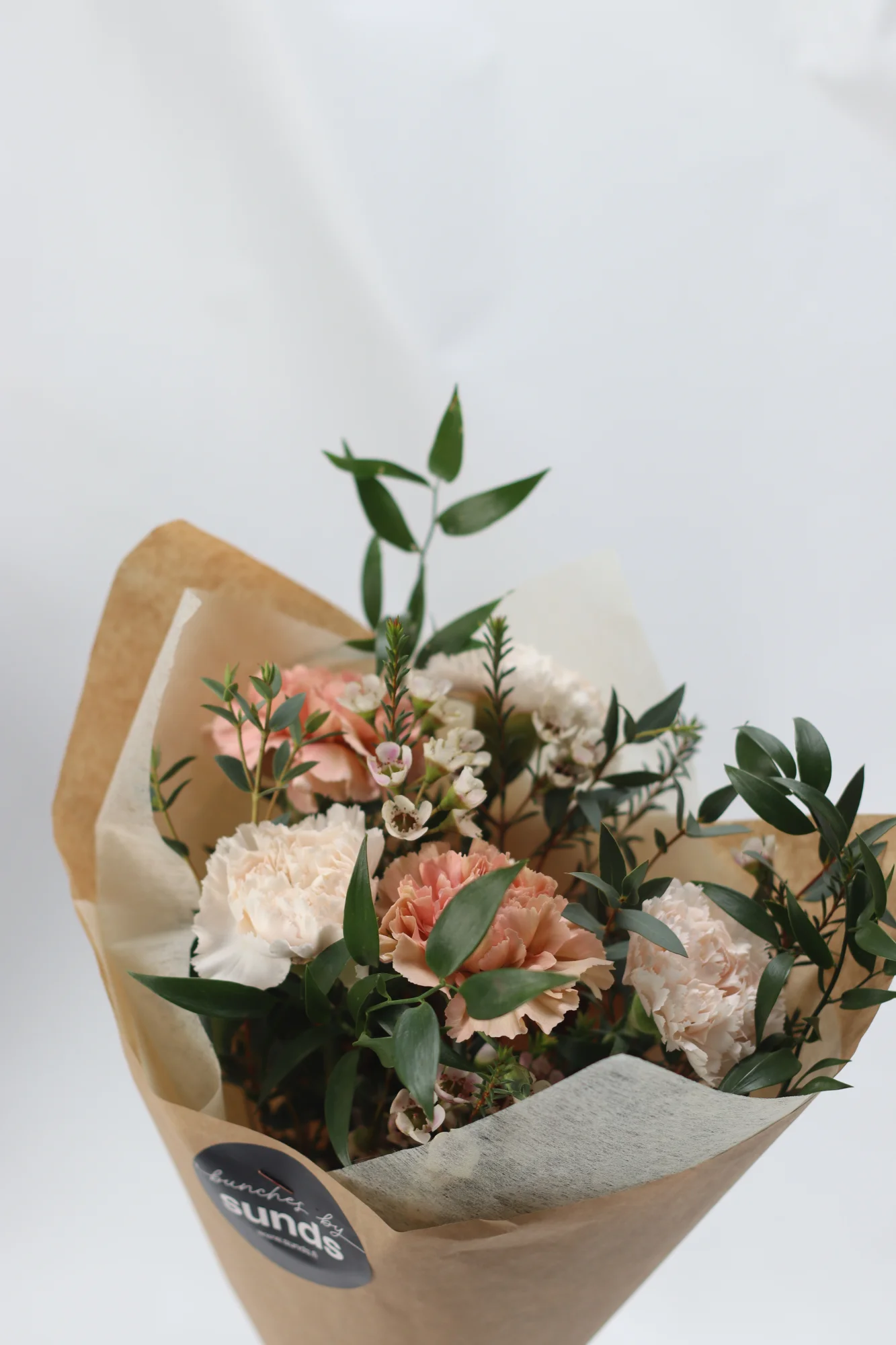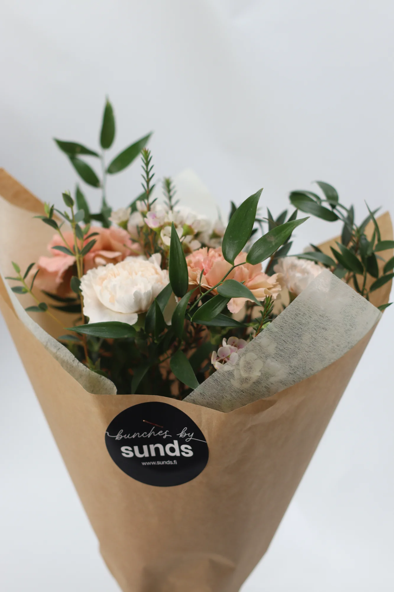 Buketten innehåller: nejlika, vaxblomma och ruskus