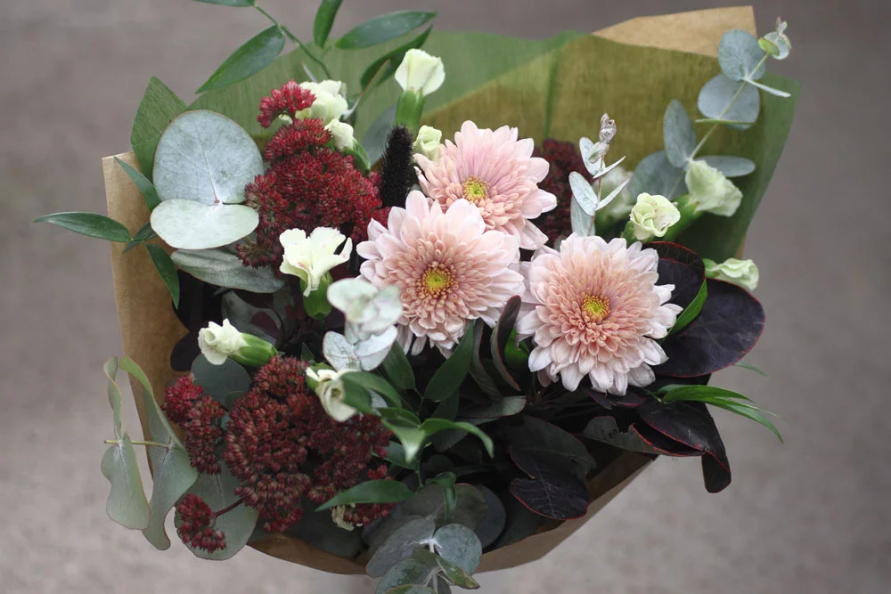 Buketten innehåller: krysantem ,kvistnejlika, eukalyptus, sedum