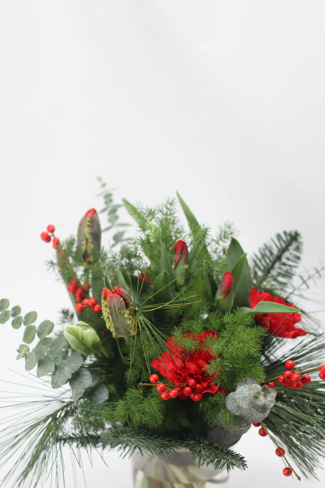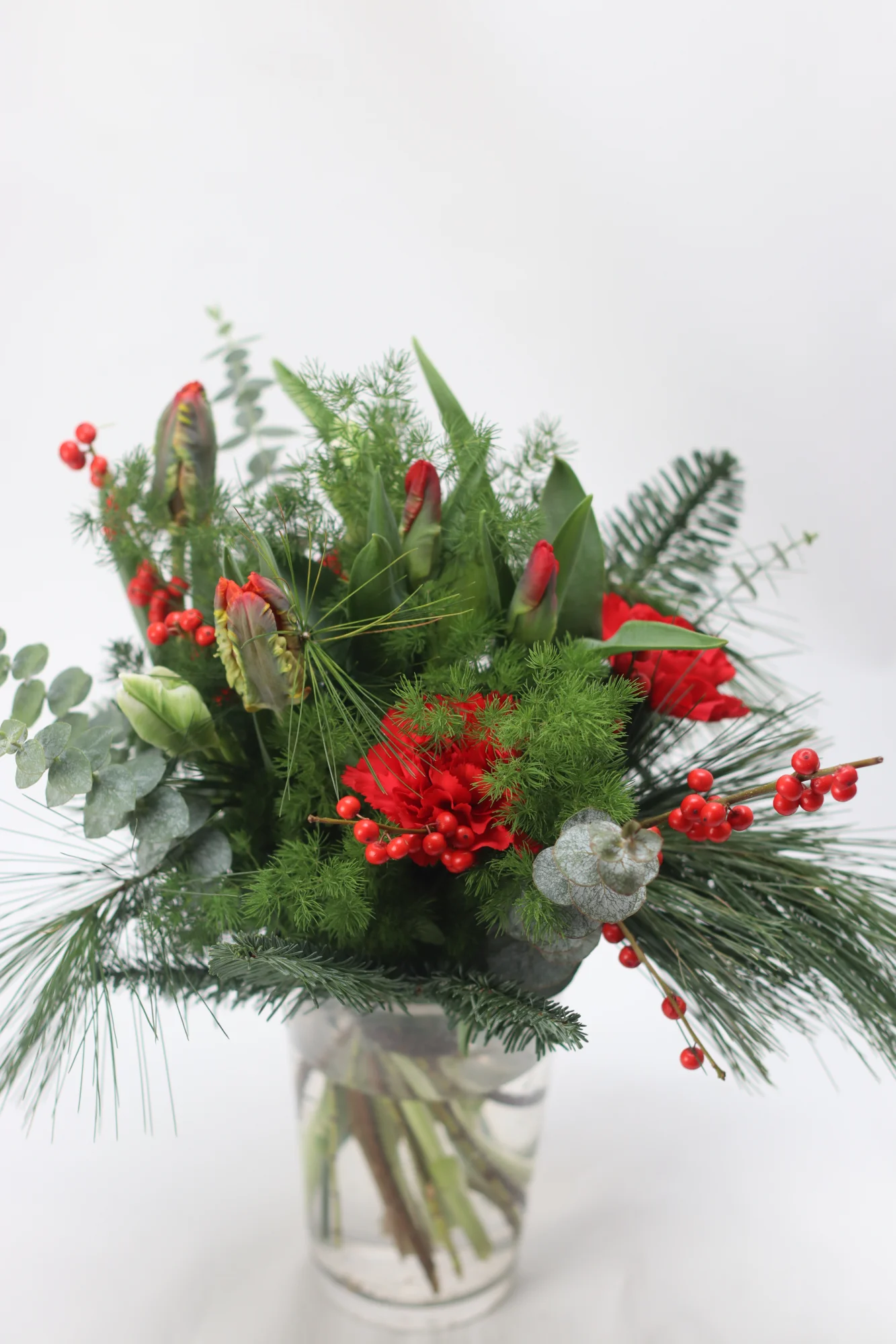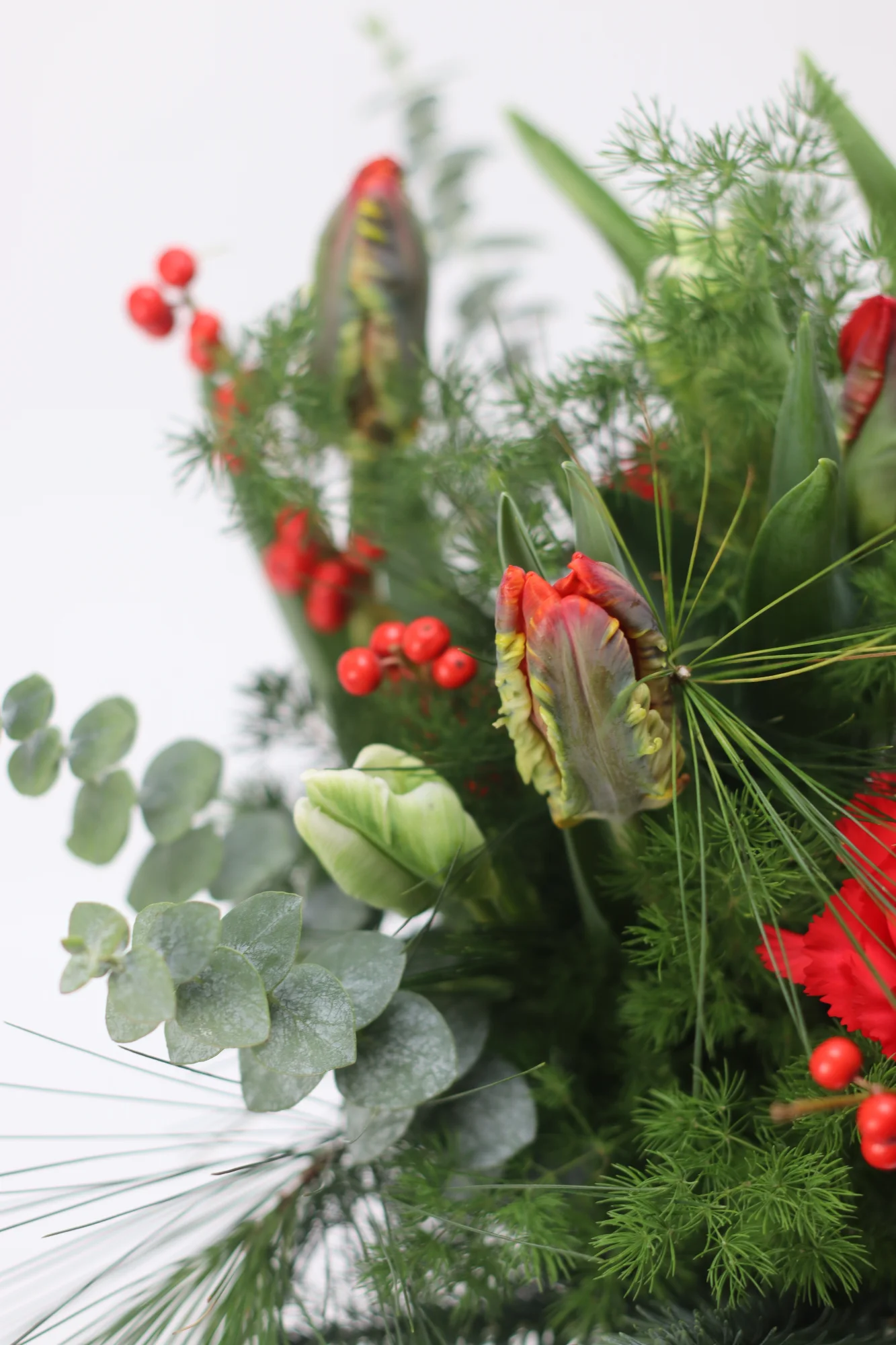 Buketten innehåller: tulpan, nejlika, ilex, eucalyptus, sparris, tall