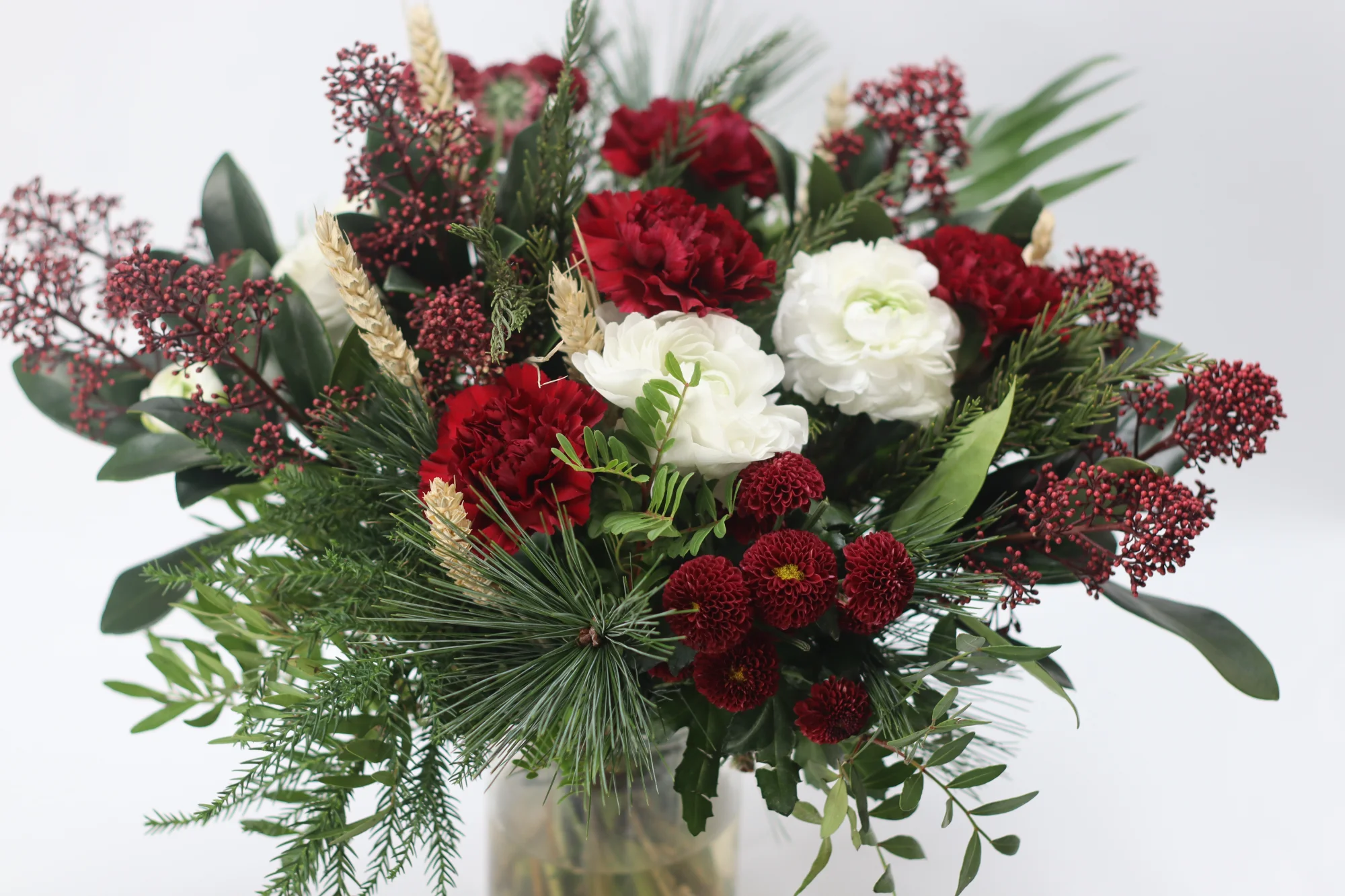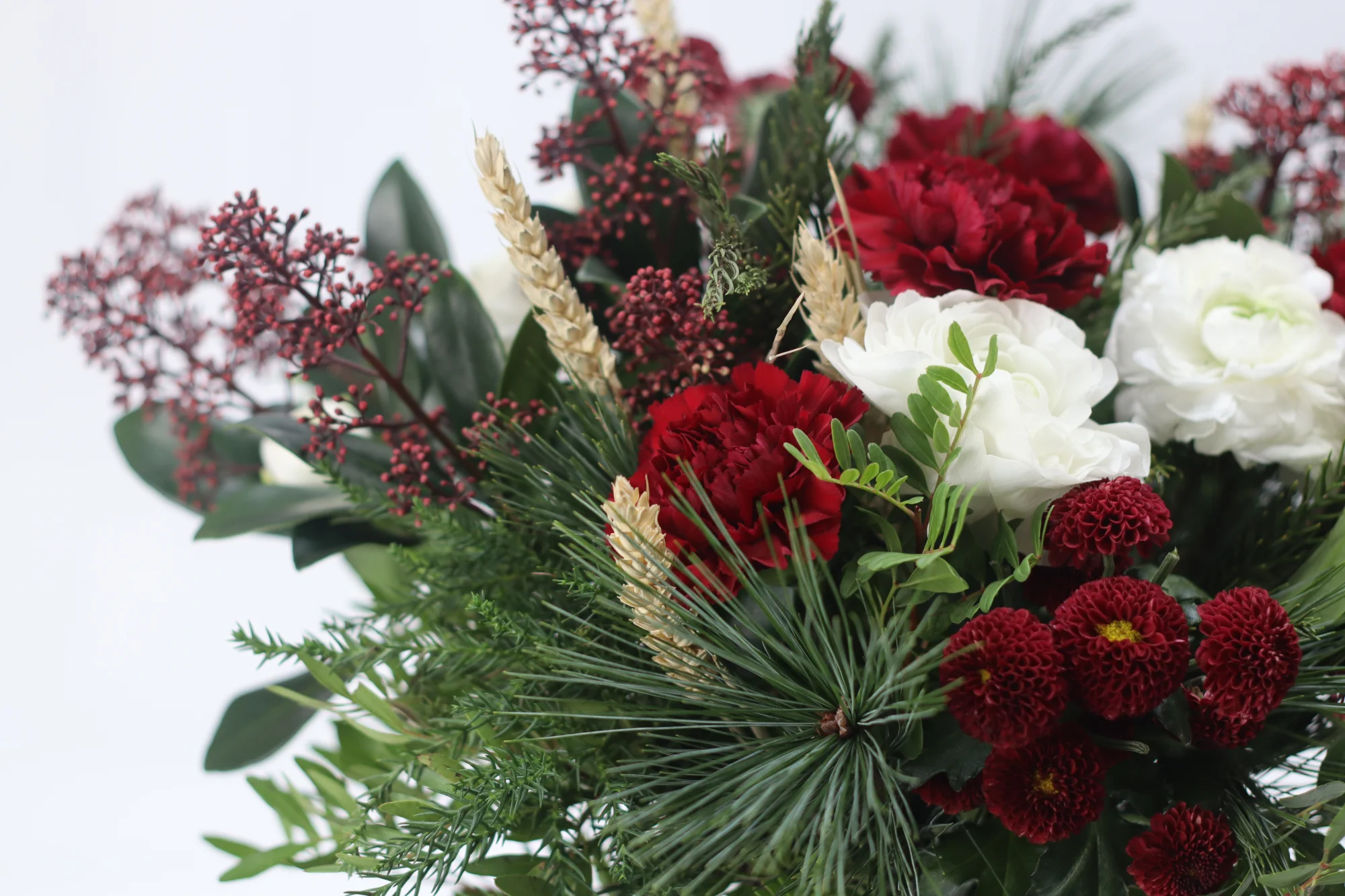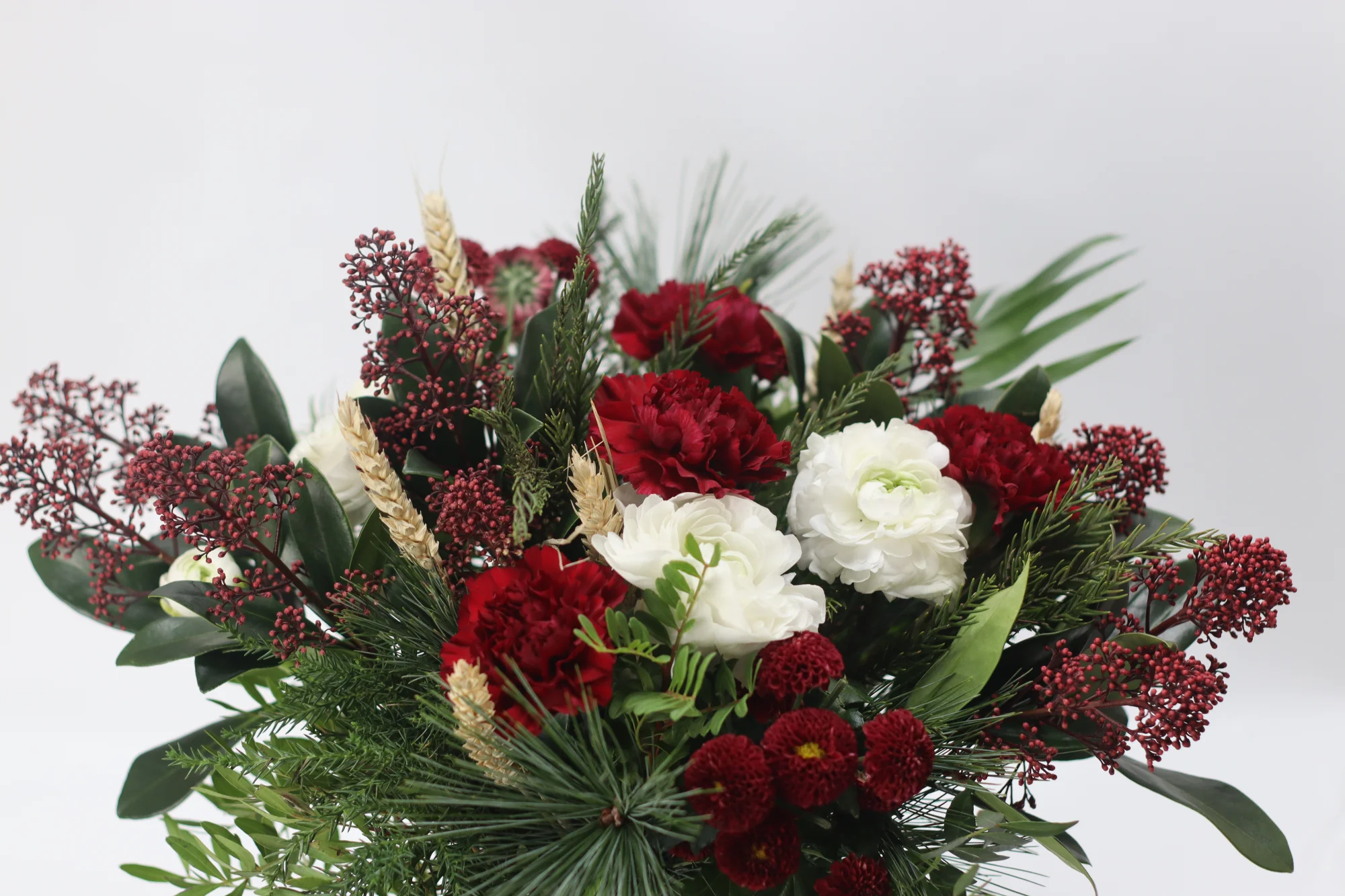 Buketten innehåller: nejlika, skimmia, ranunkel, krysantem, tall