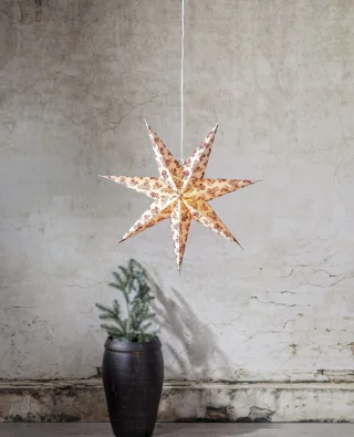 Lys upp fönstret i juletid med pappersstjärnan Kotte från Noortrade i beige och rött. En elegant och stämningsfull juldekoration med vackert motiv av kottar och barr – perfekt för att skapa varm och traditionell julkänsla i hemmet.