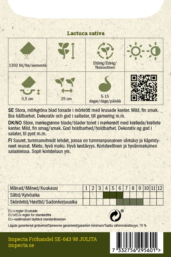 Stora, mörkgröna blad tonade i mörkrött med krusade kanter. Mild, fin smak. Bra hållbarhet. Dekorativ och god i sallader, till garnering m.m.