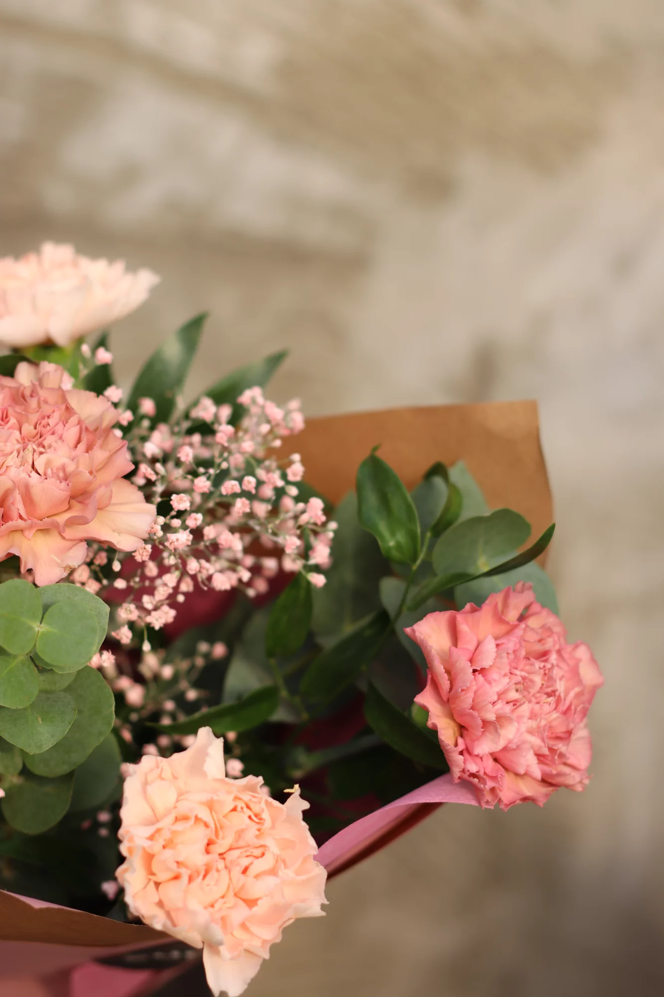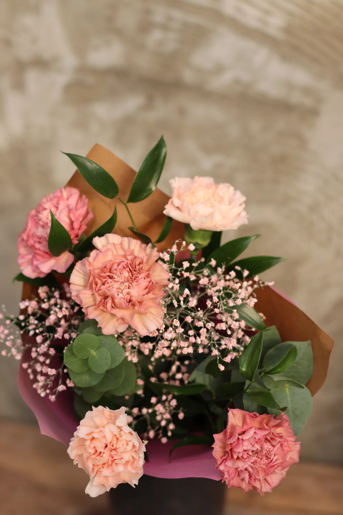 Buketten innehåller: nejlika, brudslöja, ruskus